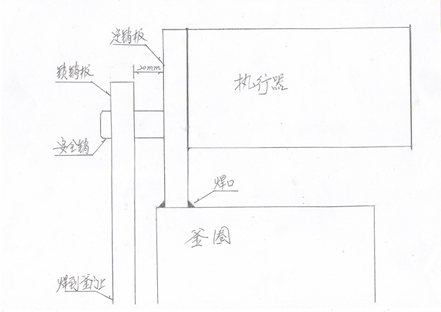 2.3.1.測量容器殼體齒圈的內(nèi)齒面距密封面距離的1/2處到釜體斷面的實際尺寸,在齒圈外壁上畫安全銷縱中心線。