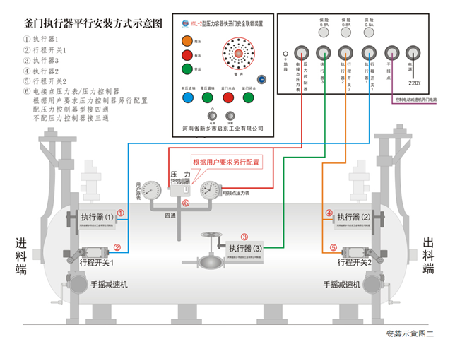 1.將主控箱安裝在便于觀察操作、防水防雨的地方,接通AC220V電源。將三通(壓力控制需配四通)安裝在進料端釜門上部原壓力表處。