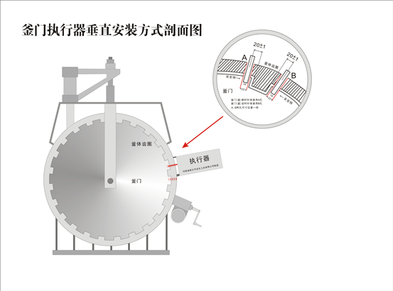 2.3.2.將壓力容器的快開門裝置關(guān)好,使其處于鎖緊閉合到位,確認鎖緊及開啟方向,按《安全聯(lián)鎖裝置安裝圖》規(guī)定,在外齒圈鎖緊時的前進方向,距殼體內(nèi)齒圈前端20±1mm在齒圈上畫安全銷孔橫中心線,兩點交叉處為銷孔圓心。
